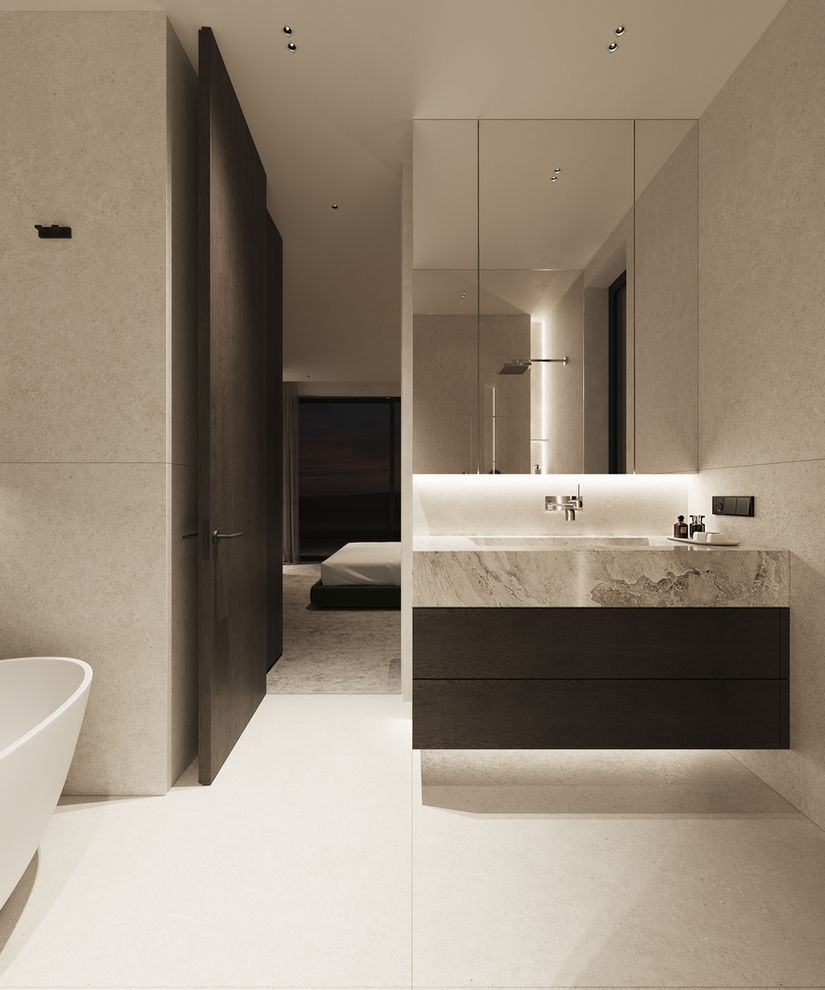 Sypialnia i łazienka to prawdziwe oazy spokoju, gdzie minimalizm form łączy się z luksusem. Proste linie, wysokiej jakości materiały i starannie dobrane elementy wyposażenia tworzą spójny, harmonijny wygląd, który zachwyca swoją prostotą i elegancją.